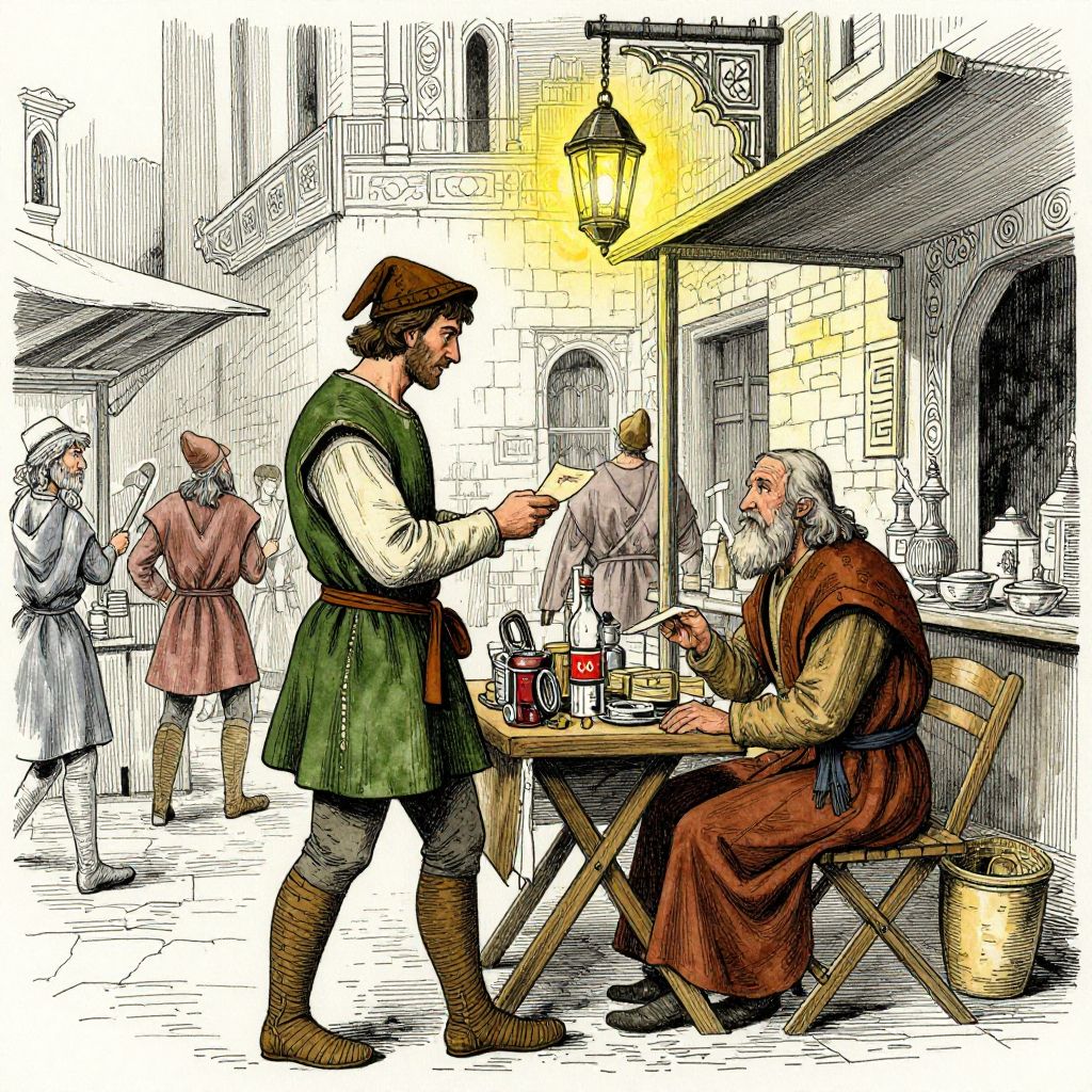In this medieval ink and watercolor style painting, two figures stand in a bustling marketplace. The merchant, dressed in a green tunic and a brown hat, holds a letter in his hand, seemingly in the midst of a transaction. His counterpart, an older man with a long beard, sits at a table cluttered with various items, possibly goods for sale. The scene is set against a backdrop of stone buildings with ornate details, and a hanging lantern casts a warm glow. The overall composition is dynamic, with the figures positioned in the foreground, creating a sense of depth and perspective. The interplay of colors, from the earthy tones of the clothing to the vibrant hues of the marketplace, adds to the rich texture and atmosphere of the scene.