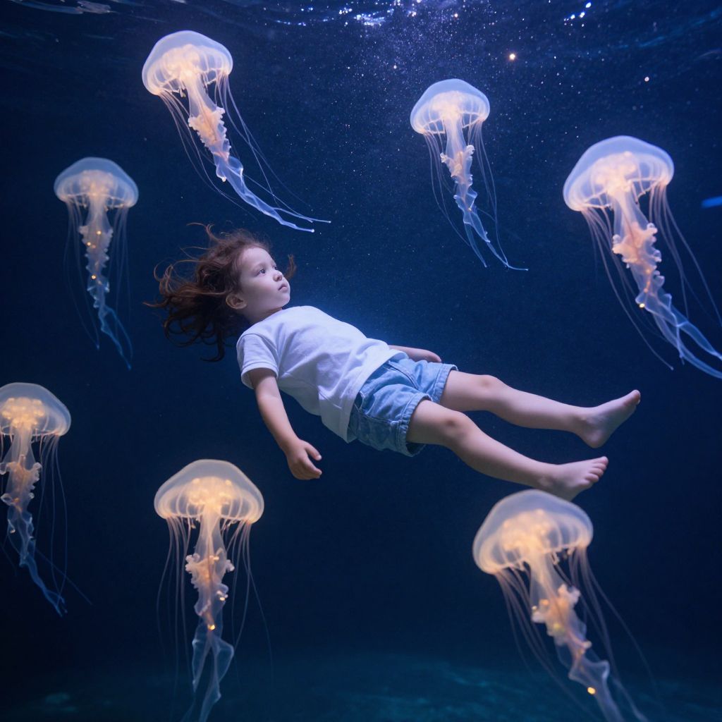 A child floats serenely among luminous jellyfish, their ethereal glow illuminating a dreamlike underwater realm where gravity seems suspended and stardust drifts like whispers of wonder.