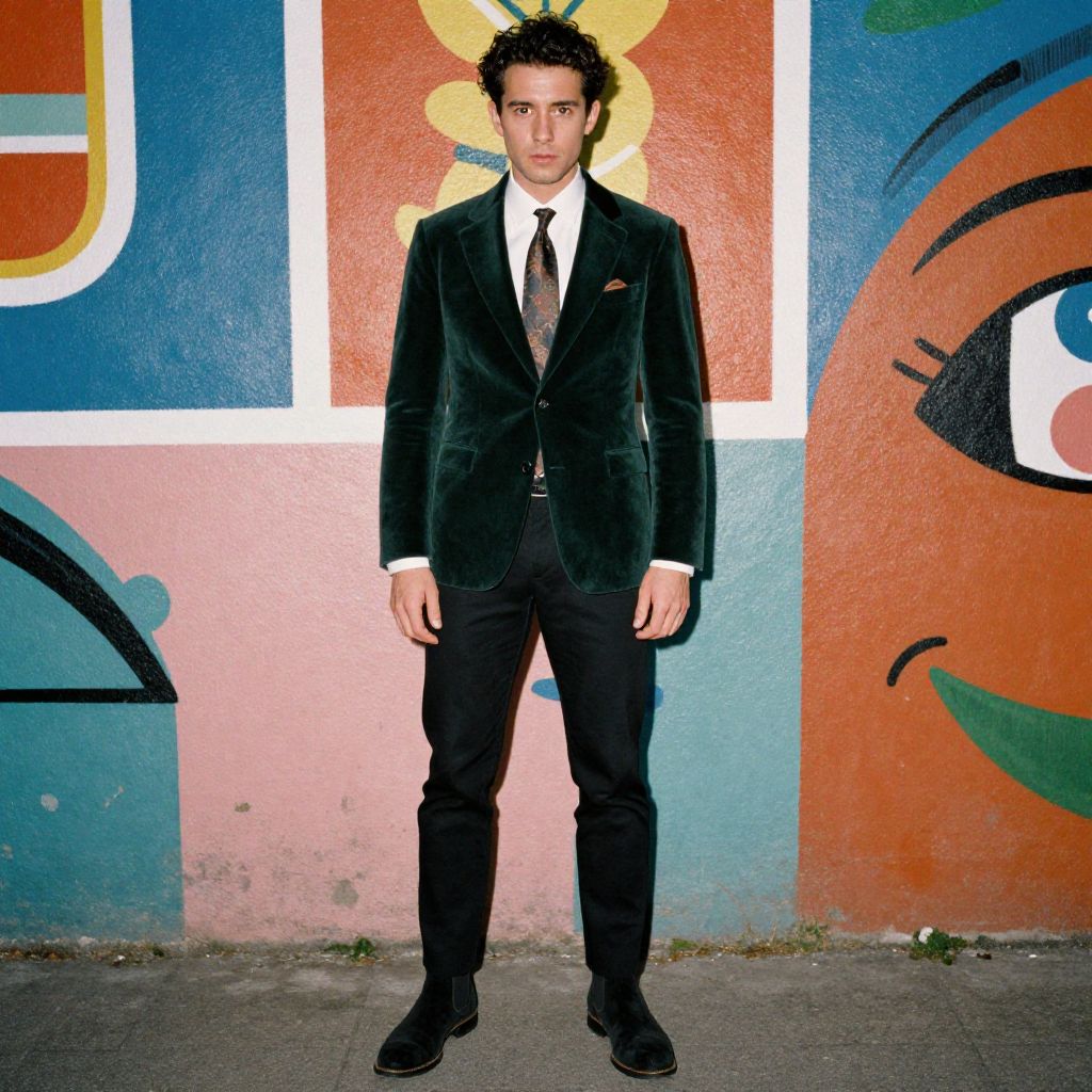 A man, dark green velvet blazer, white dress shirt, black slim-fit trousers, patterned silk tie, black suede Chelsea boots, vibrant murals, 3M ferrania analog film stock, confident expression Man has masculine face and piercing eyes