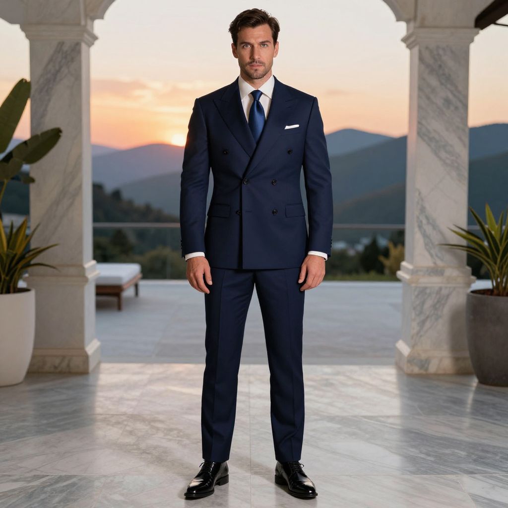 A man, midnight blue double-breasted suit, ivory dress shirt, silk navy tie, glossy black monk strap shoes, elegant marble interiors, private terrace with sunset vistas, serene mountain backdrop, vibrant colors, confident expression Man has masculine face and piercing eyes