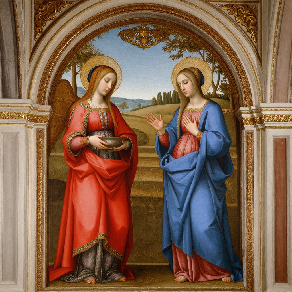 Fra Angelico's depiction of the Virgin Annunciate portrays two women in ornate robes, one in vibrant red and the other in deep blue, standing within an arched colonnade that frames a serene pastoral landscape beyond. The woman in red holds a bowl, while the woman in blue gestures gracefully, both adorned with halos and surrounded by intricate architectural details and golden embellishments.