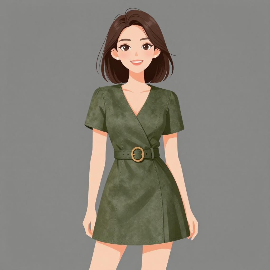 Woman with pretty face and pretty hair. smiling Woman, casual chic, olive green faux suede mini dress, short sleeves, V-neckline, seamed detailing, attached belt with round buckle at the waist, slight flare to the skirt, studio background with a seamless grey backdrop. --sref 1467
