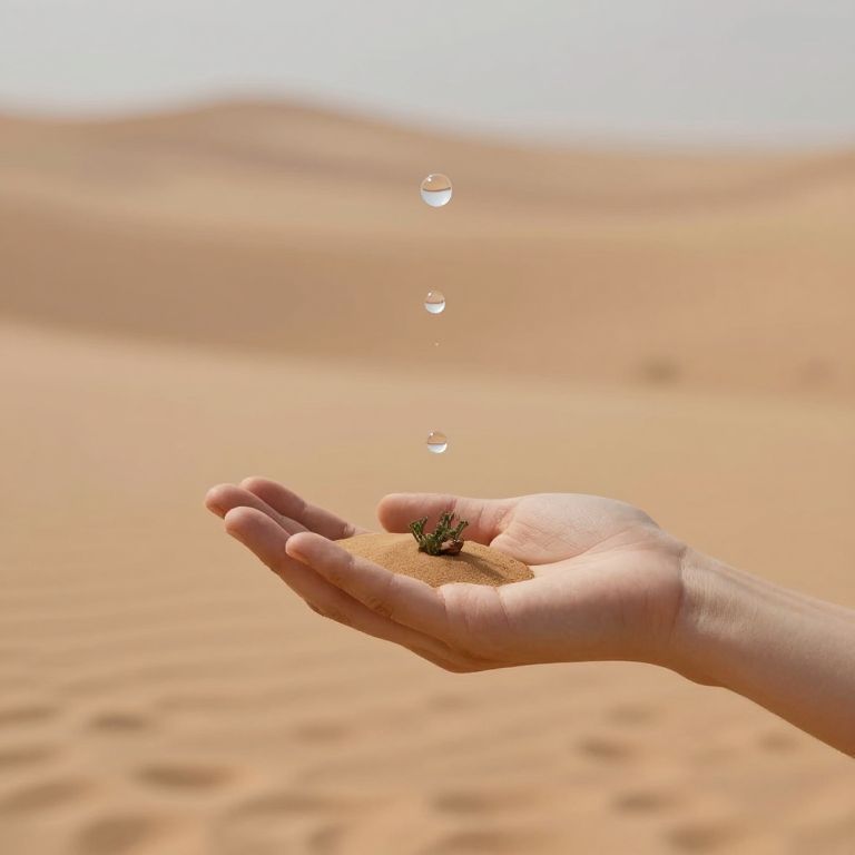 Photograph of a hand cupping sand with a small ant, with three water droplets falling from above, in a sandy desert.