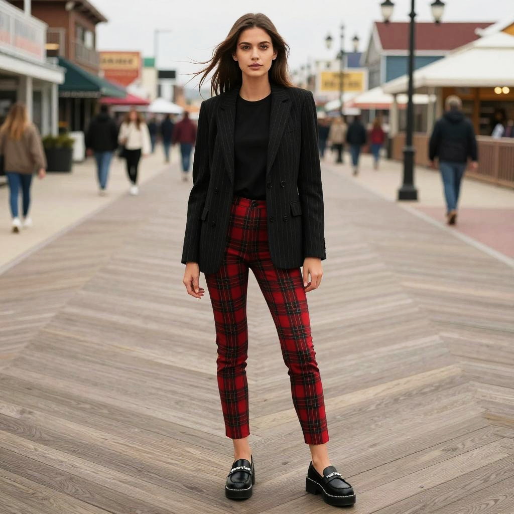 A slim woman in a casual chic outfit featuring a black pin-striped blazer, a simple black t-shirt, and red plaid slim-fit pants, stands at a fashionable boardwalk in Asbury Park. She wears black platform loafers with white stitching, has natural makeup, and her straight loose hair flows gently in the breeze. The scene is illustrated in the visual style of JC Staff. Sexy. Pretty face and beutiful eyes