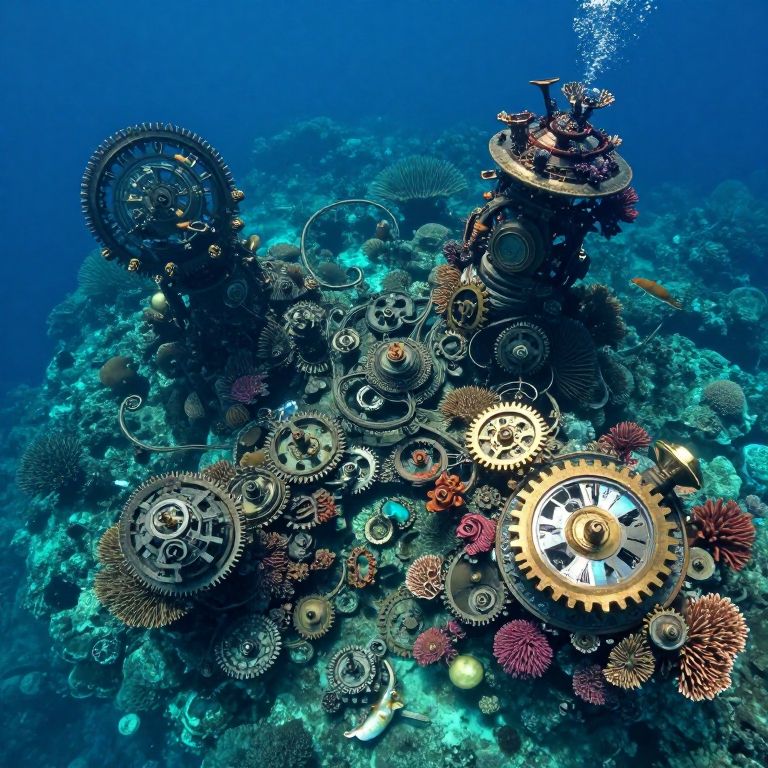 Envision an otherworldly underwater tableau, reminiscent of surreal dreamscapes, where living coral reefs and intricate gears coalesce in a fantastical dance. This mesmerizing seascape is observed from an uncommon aerial 'flying fish-eye' viewpoint, gliding above the aquatic expanse while gazing upon a kaleidoscopic panorama of marine life merging with clockwork marvels. The resultant emotional spectrum of this enigmatic fusion of nature and machinery fosters a profound sense of serenity and curiosity, beckoning viewers to delve into the secrets of this beguiling subaquatic domain that defies our perception of reality.
