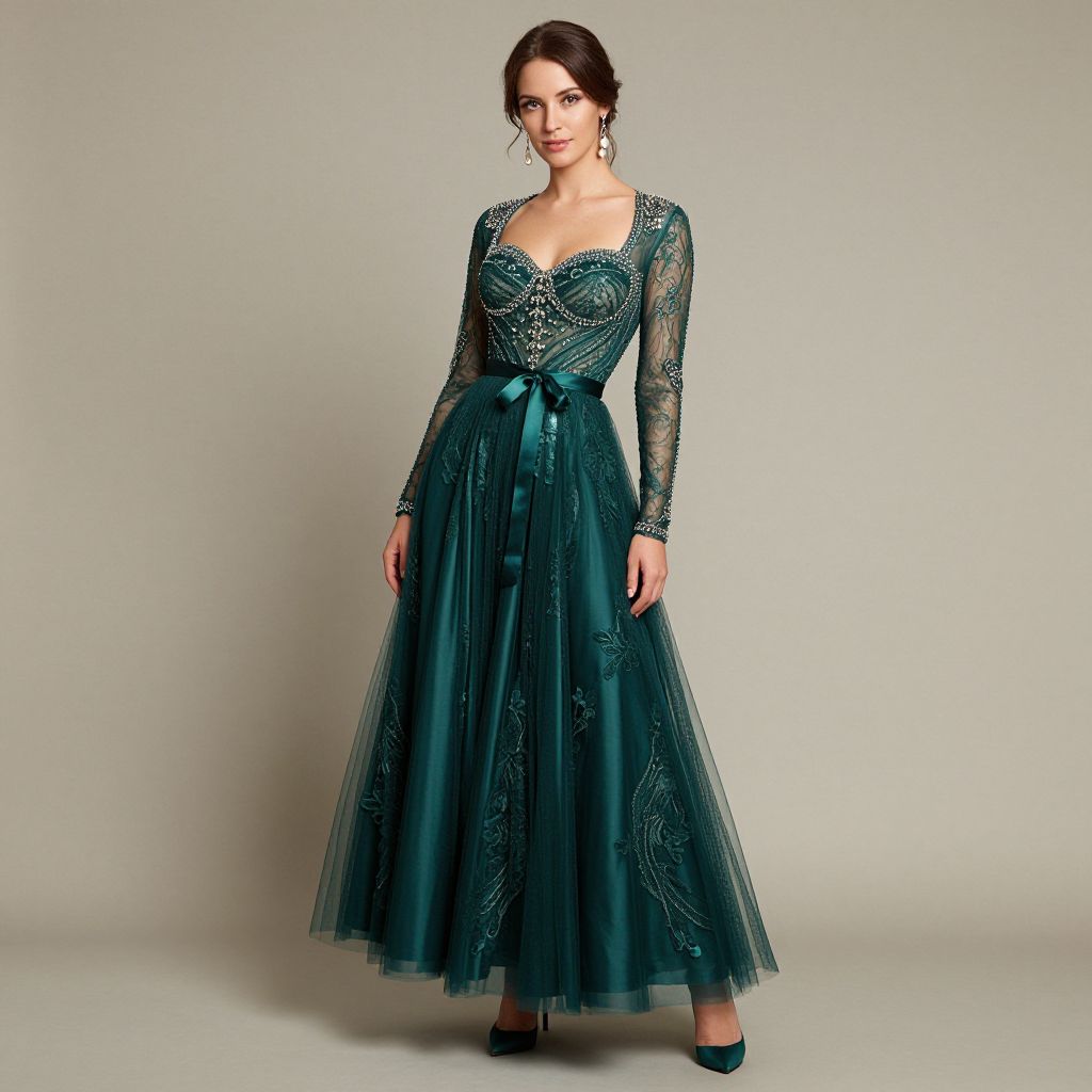 Photograph of a young woman with fair skin and dark brown hair in an elegant updo, wearing a long, dark teal evening gown. The gown features a sheer lace bodice with intricate floral patterns, a sweetheart neckline, and long sleeves. A matching teal ribbon ties a subtle bow at the waist, accentuating the voluminous, tulle skirt adorned with delicate lace details. She wears matching teal high heels and ornate chandelier earrings. The background is a plain, light gray, putting full focus on the dress and her poised, elegant stance.