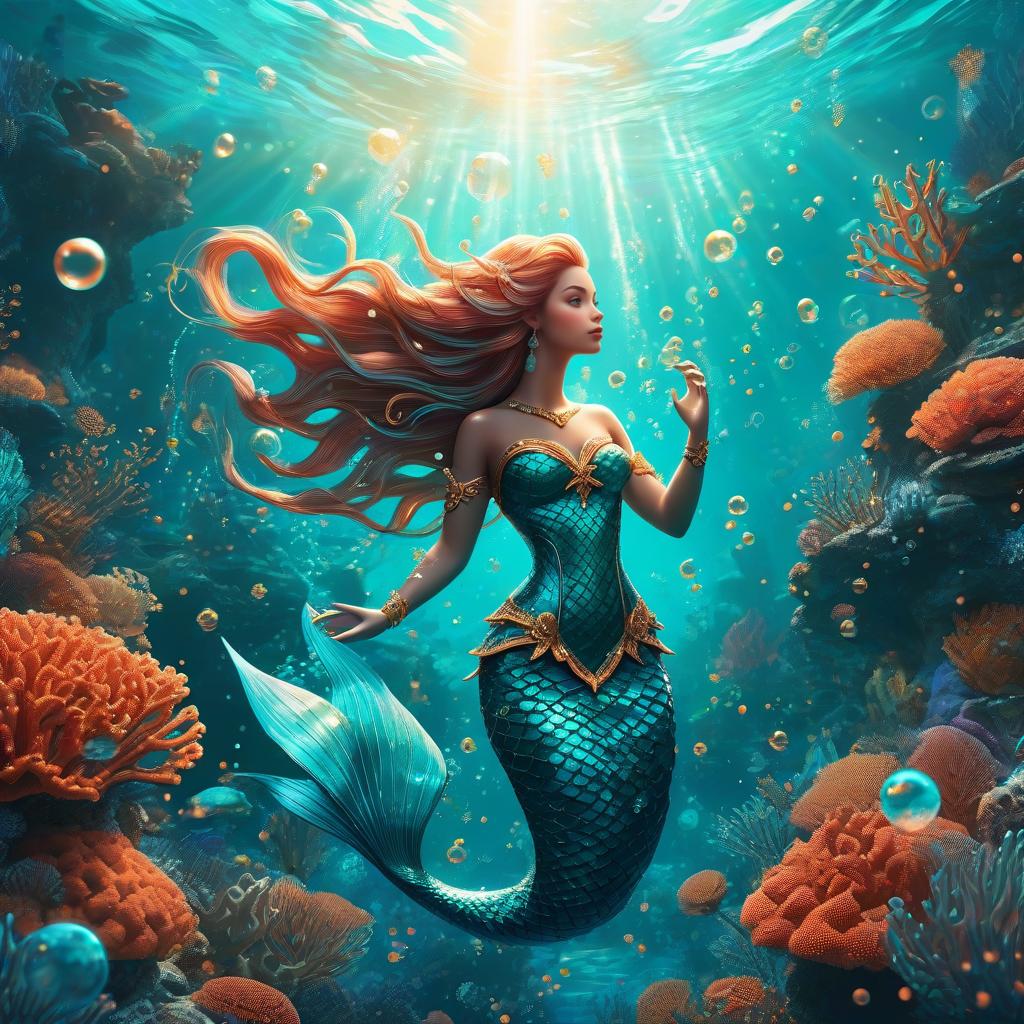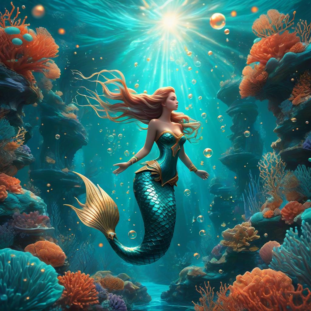 Mystical illustration style featuring a shimmering mermaid surrounded by coral and bubbles. Rendered in a wide-angle view with vibrant elements and intricate patterns, the artwork combines turquoise and gold for a dramatic effect. The mermaid and coral are in the foreground, with an underwater background adding depth. Glowing bubbles and intricate lines create a magical ambiance, enhanced by a soft aquatic lighting and a mystical filter. The balanced composition emphasizes the mystical quality and vibrant highlights, creating a captivating scene.