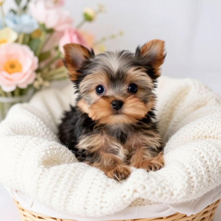 A min pin yorkie mix puppy nestled in a basket with knitted blankets, surrounded by pastel flowers, soft diffused light creating a dreamy effect, tiny paws tucked in, capturing the delicate mixed-breed charm, intricate fur details and gentle ambiance