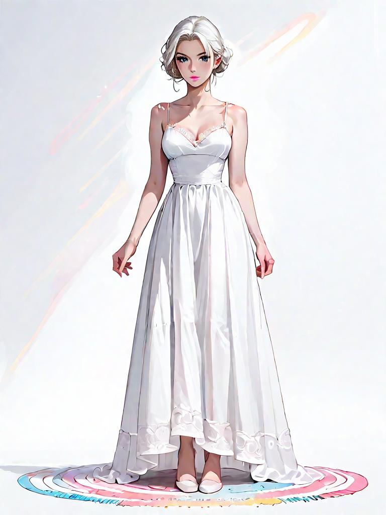 1girl, source_comics, realistic face, full body shot, Woman, casual chic, light blue ribbed knit mini dress, v-neckline, spaghetti straps, fitted silhouette, frayed hem, delicate necklace, white studio background