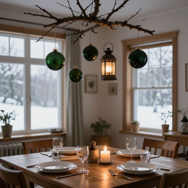 Lanterns and dark green spherical ornaments hang gracefully from a bare tree branch above a wooden dining table set with white plates, silverware, lit candles, and a book, creating a cozy and rustic ambiance in a warmly lit room with large windows revealing a winter landscape outside.