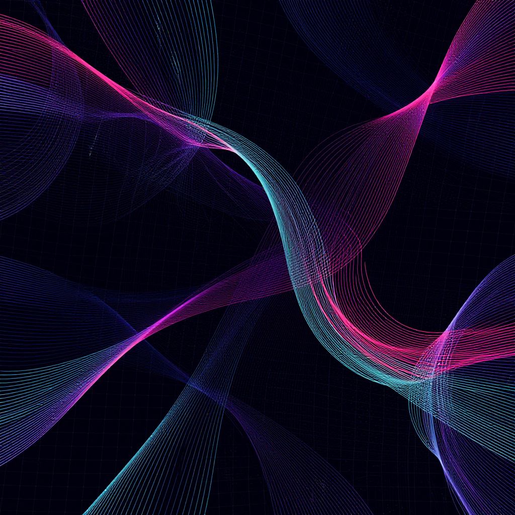 AI pattern generator visualizing abstract data streams as vibrant flowing ribbons and grids, high contrast colors with neon highlights on dark backgrounds, emphasizing technology, innovation, and artificial intelligence themes in a dynamic digital composition