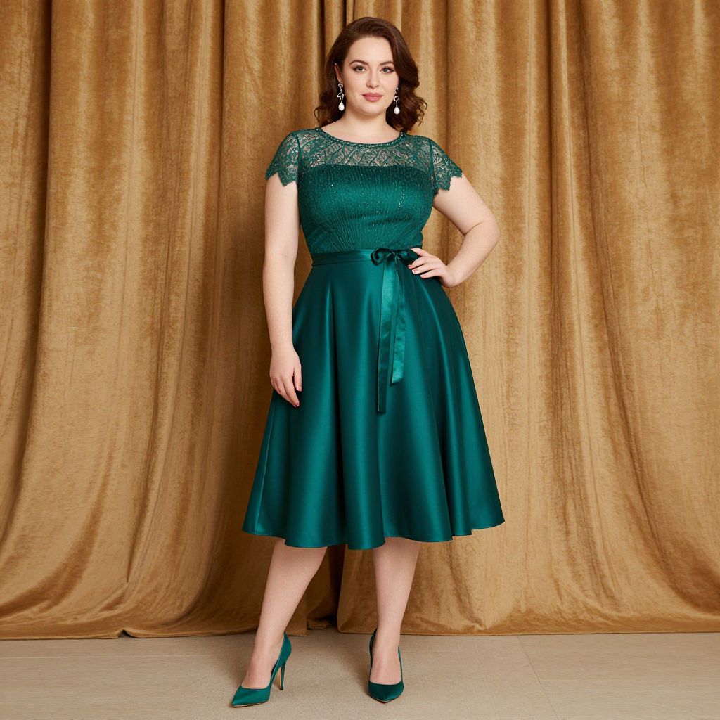 Full body shot, stocky woman, elegant couture formal cap sleeve dress, rich emerald silk fabric, fitted bodice, flared knee-length skirt, intricate lace detailing on sleeves, delicate beading around neckline, cinched waist with satin ribbon, matching emerald stiletto heels, statement pearl earrings, soft waves hairstyle, natural makeup, sophisticated pose, luxurious backdrop Sexy. Pretty face and beаutiful eyes. Big breasts