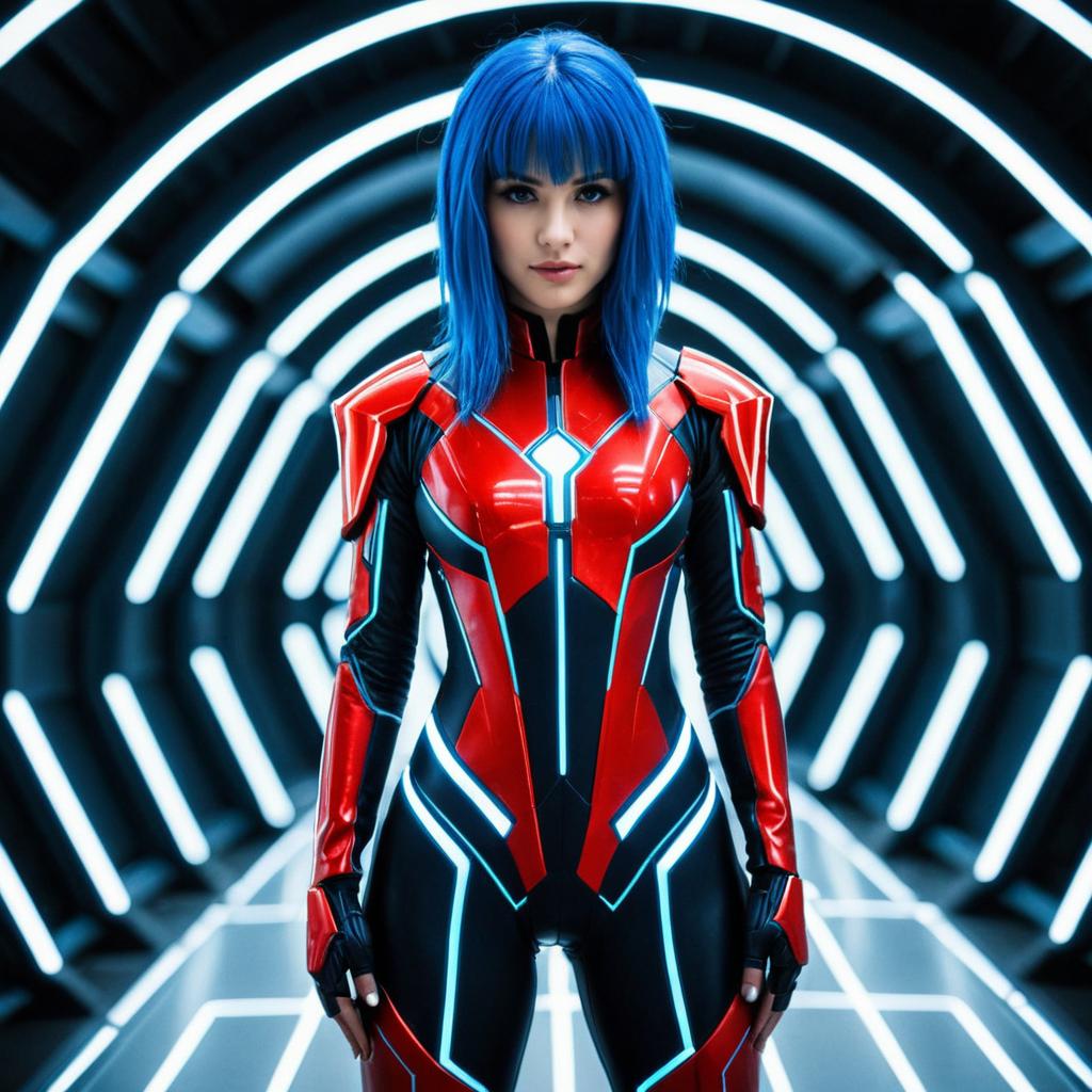 Quorra tron cosplay,1girl, solo, bodysuit, blue hair, long hair, armor, science fiction, realistic, blurry, red bodysuit, looking at viewer