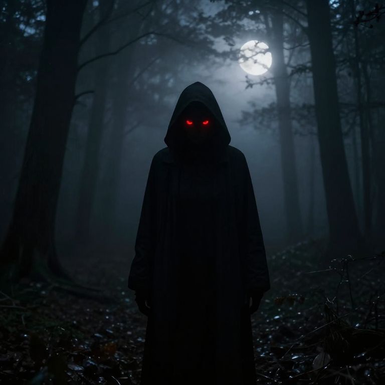 A digital illustration depicts a shadowy figure standing in a dark, misty forest at night. The figure, cloaked in a hooded, black garment, has glowing red eyes and stands centrally in the image. The forest background features tall, slender trees with fog obscuring the details. A bright, full moon shines in the top right, casting a bluish light that enhances the eerie atmosphere. The ground is covered in dark foliage and leaves. The overall color palette is dominated by deep blues and blacks, creating a mysterious, ominous mood.