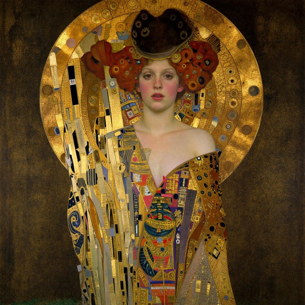 Portrait of a beautiful sad female, elegant, digital painting, pre-raphaelites, highly detailed, concept art, smooth, sharp focus, gold and indigo, illustration, art by klimt .