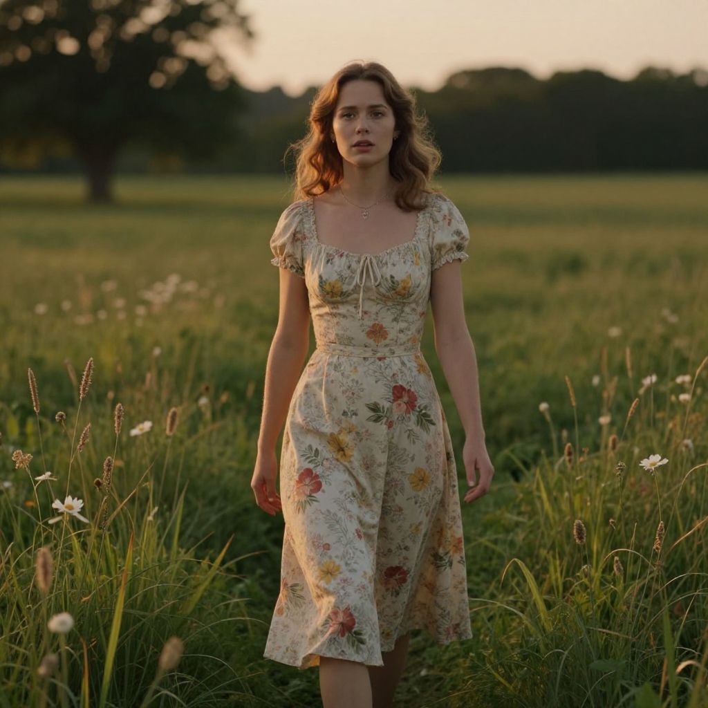 Photograph of a young woman with wavy, shoulder-length brown hair, walking through a sunlit, grassy field with white wildflowers. She wears a light-colored, floral-patterned dress with short puffed sleeves and a square neckline. Her expression is neutral, and she has a slim build. The background features a blurred tree and a darkening sky, suggesting late afternoon. The image has a warm, golden glow, emphasizing the soft textures of the dress and the greenery around her.