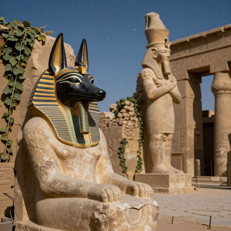 Photograph of an ancient Egyptian scene featuring a large, detailed stone statue of the god Anubis in the foreground. Anubis has a black jackal head with gold and blue striped ears and neck, and a beige, textured body. Ivy vines partially cover a stone wall to the left. In the background, a tall stone statue of a human figure with an ankh symbol in one hand stands in front of an ornate temple-like structure with columns. The sky above is clear and blue, adding contrast to the sandy-colored stone.