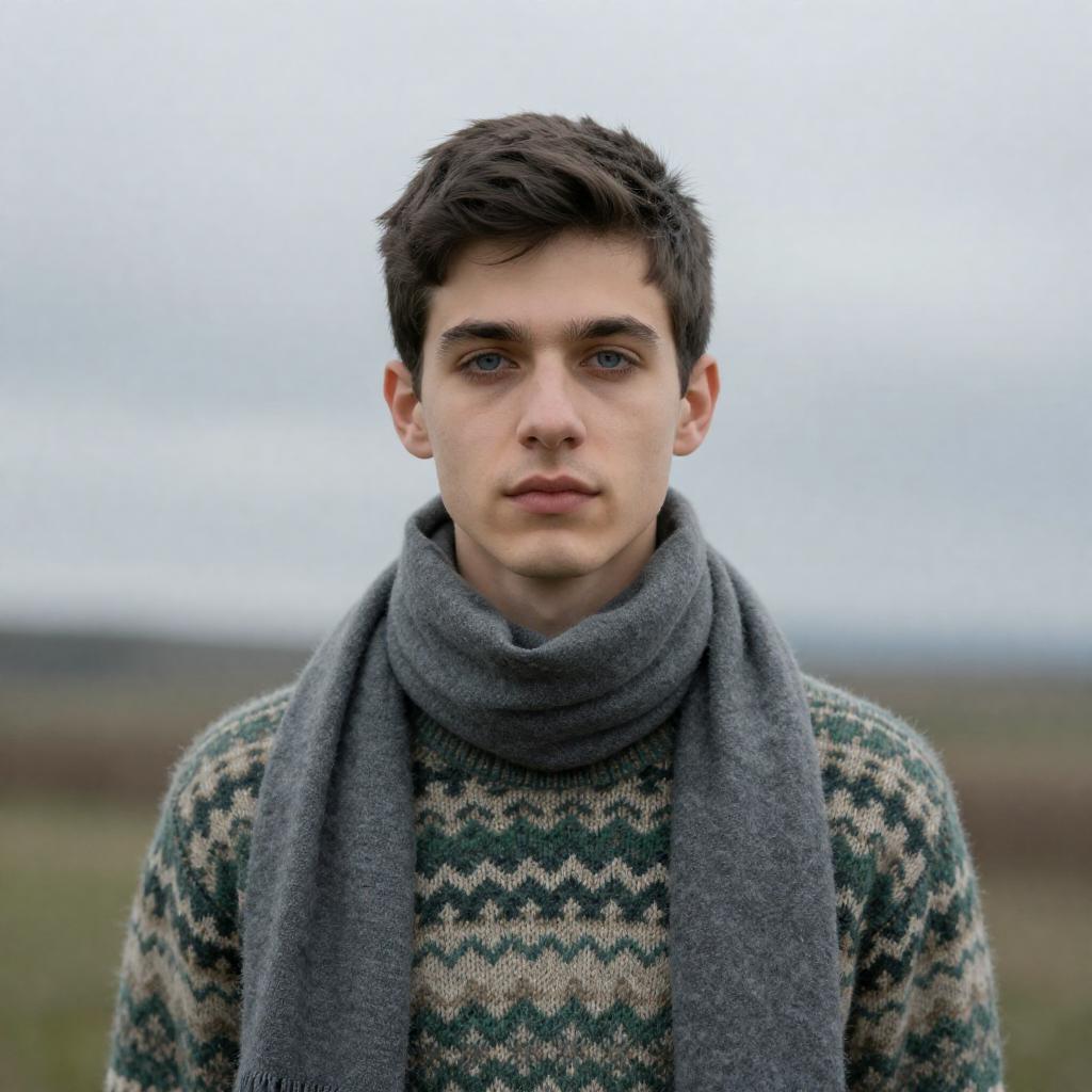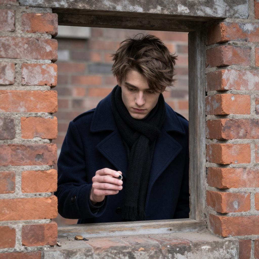 Photograph of a young man with tousled brown hair, wearing a dark blue coat and black scarf, peering through a broken brick window. He holds a small object in his right hand, with a focused expression. The background consists of uneven, weathered bricks, creating a rugged, mysterious atmosphere.