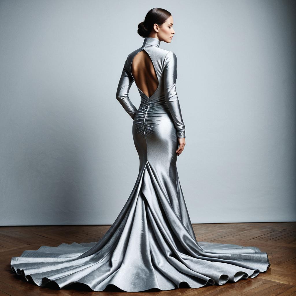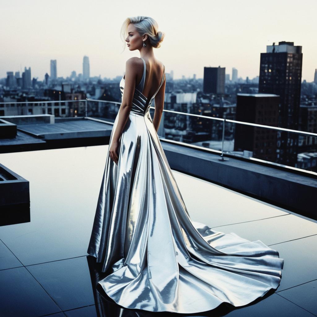 Platinum Blonde hairstyle on fashion model, wearing elegant gown, in rooftop, captured in fashion editorial style with glossy reflection.