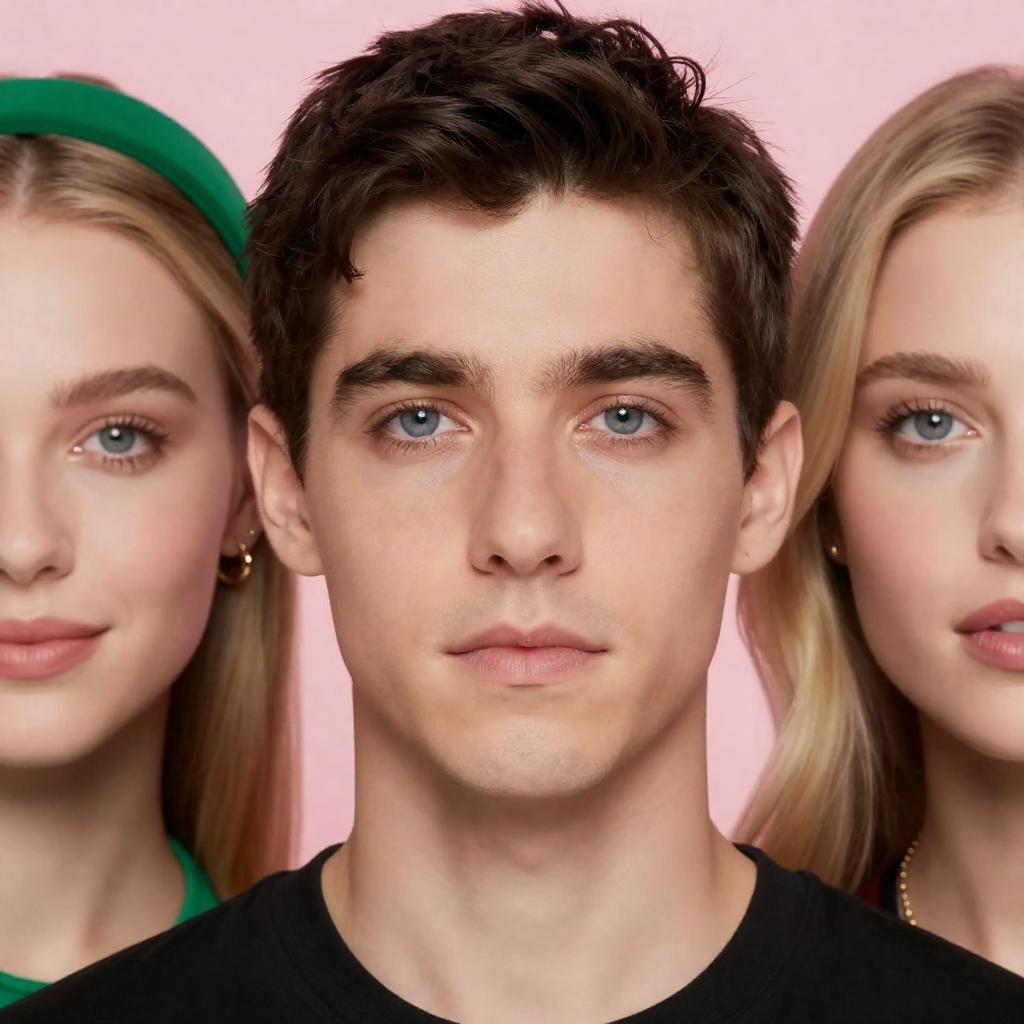 Photograph of a close-up trio. Central man with blue eyes, short dark hair, neutral expression. Blonde woman on left with green headband, light smile. Blonde woman on right with light pink lipstick, neutral expression. Pink background.