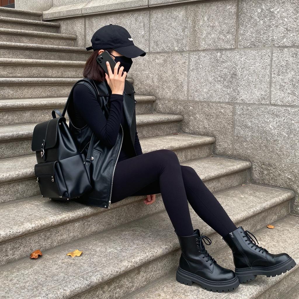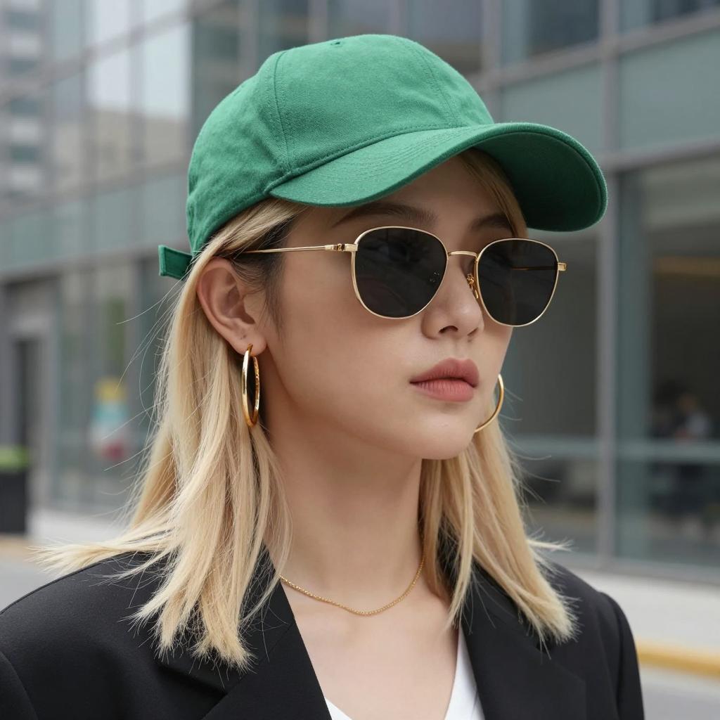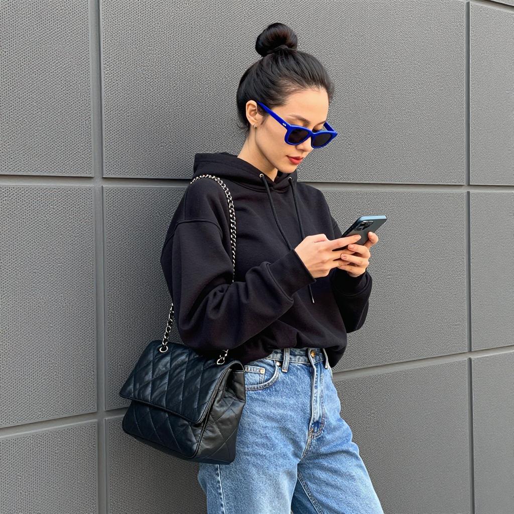 A young woman with long brown hair wearing a black puffer jacket, a black baseball cap with 'MAJICA' printed in white, and dark sunglasses. She is holding a smartphone in her right hand and a car key in her left hand, looking down at the phone. The background is an urban setting with a blurred white and black wall.