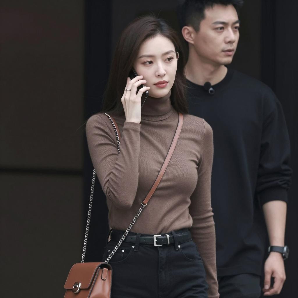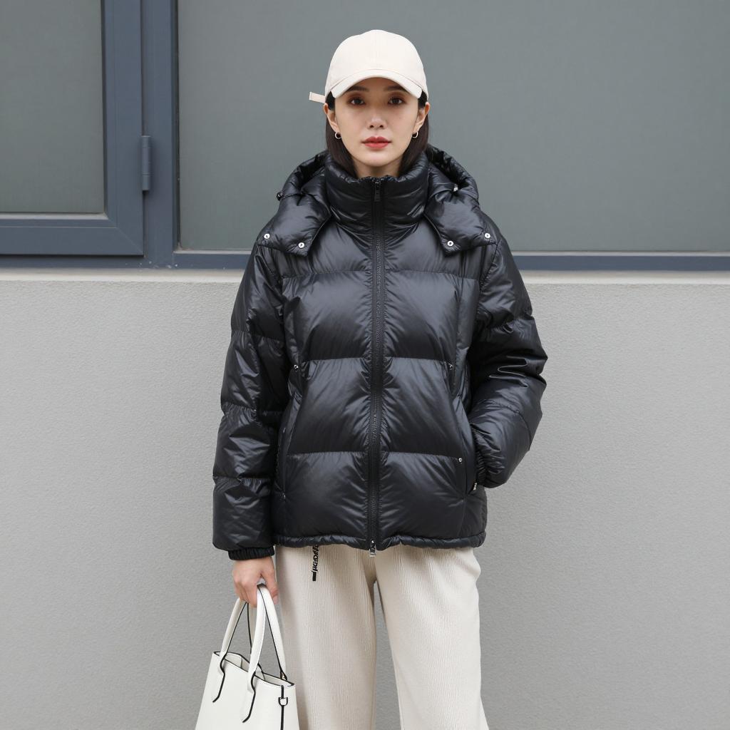 Woman with long brown hair wearing a black puffer jacket, black baseball cap with "MAJICA" in white, and dark sunglasses. She holds a smartphone in her right hand and a car key in her left. She looks down at the phone with slightly parted lips. Background is a blurred white and black wall.