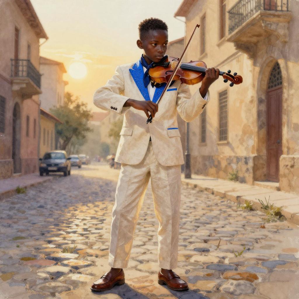 An artistic portrayal of a teenage East African boy violinist with tightly coiled short hair, warm dark skin, focused expressive eyes and a small scar on his left eyebrow dressed in a tailored ivory linen suit with embroidered cobalt-blue lapels, slim-cut trousers, a silk navy neckerchief, and polished brown leather loafers, standing on a cobblestone street lined with old European-style buildings bathed in golden sunset light, rendered in a surrealist watercolor and gouache painting with soft wash gradients, delicate paper texture, subtle double-exposure elements and warm ethereal backlighting.