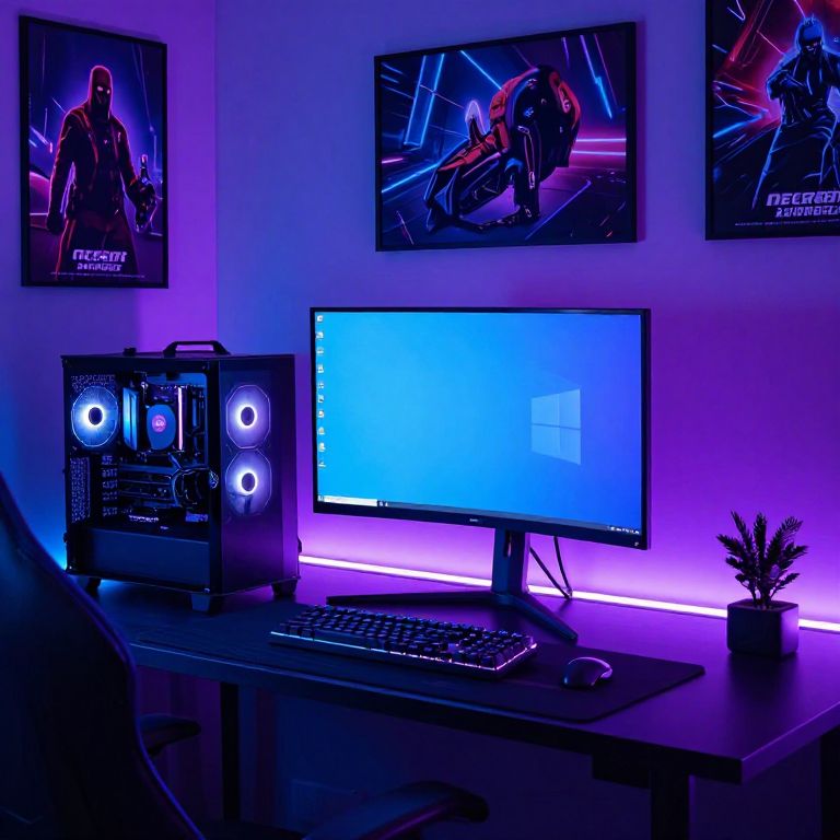 Neon-lit gaming setup with blue and purple lights, featuring a computer monitor, speakers, keyboard, mouse, and three sci-fi posters on a
