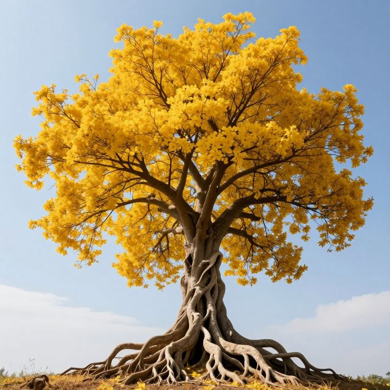 Photograph of a tall tree with a thick, gnarled trunk and sprawling roots visible at the base. The tree is adorned with bright yellow, sunlit leaves that form a dense, rounded canopy. The background features a clear blue sky with a few scattered white clouds, adding contrast to the vibrant yellow foliage. The tree stands alone on a small, grassy hill, with the ground visible at the bottom of the image, highlighting the intricate root system. The image captures the texture of the tree bark and the delicate nature of the leaves.