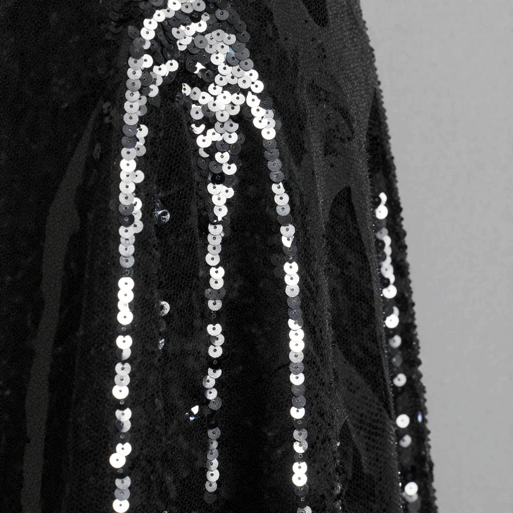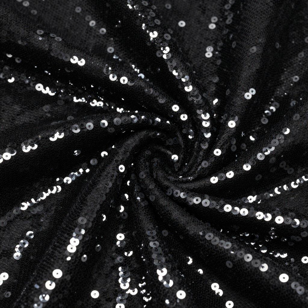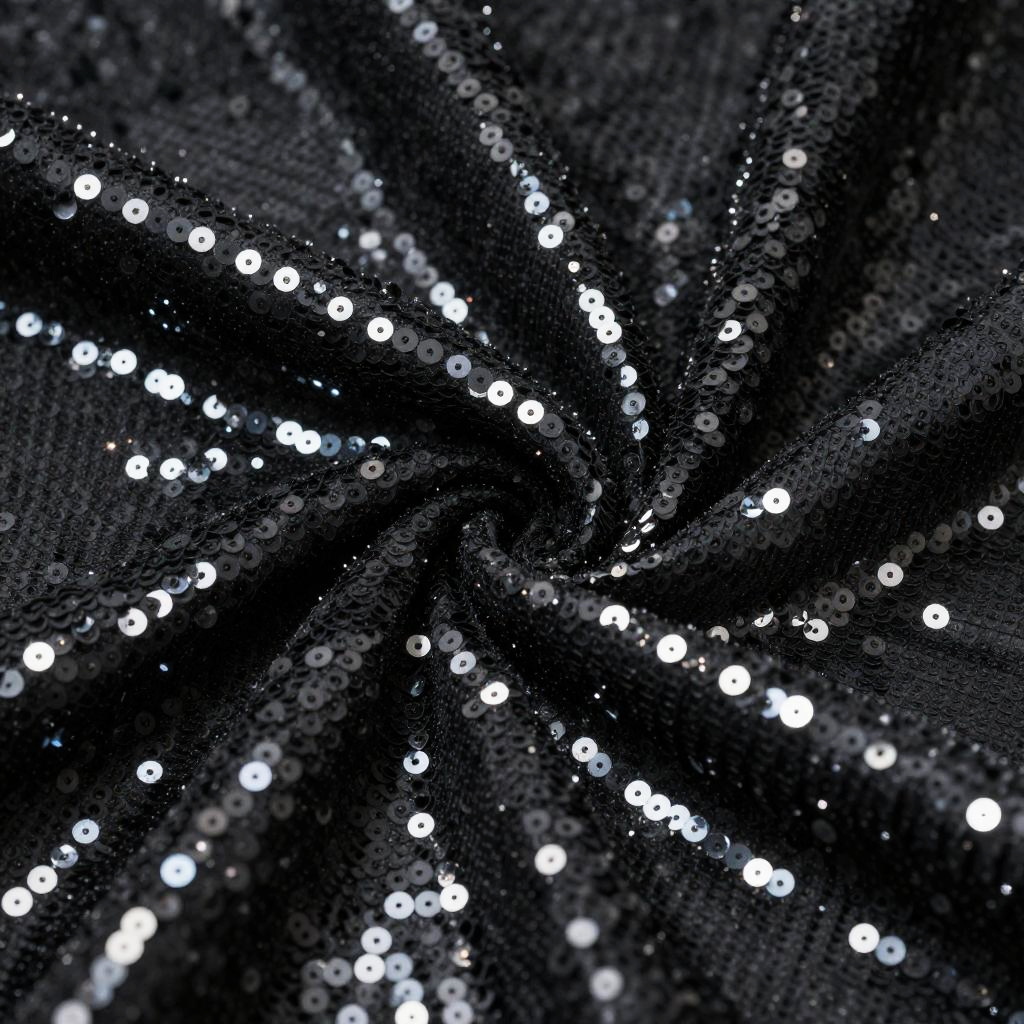 Close-up photo of a black sequined fabric with a shiny, textured surface. The sequins are densely packed, creating a sparkling effect with bright white reflections. A subtle triangle pattern is visible, adding a geometric touch to the fabric. The background is a solid grey, making the black sequins stand out even more. The image has a high-contrast, almost abstract feel.