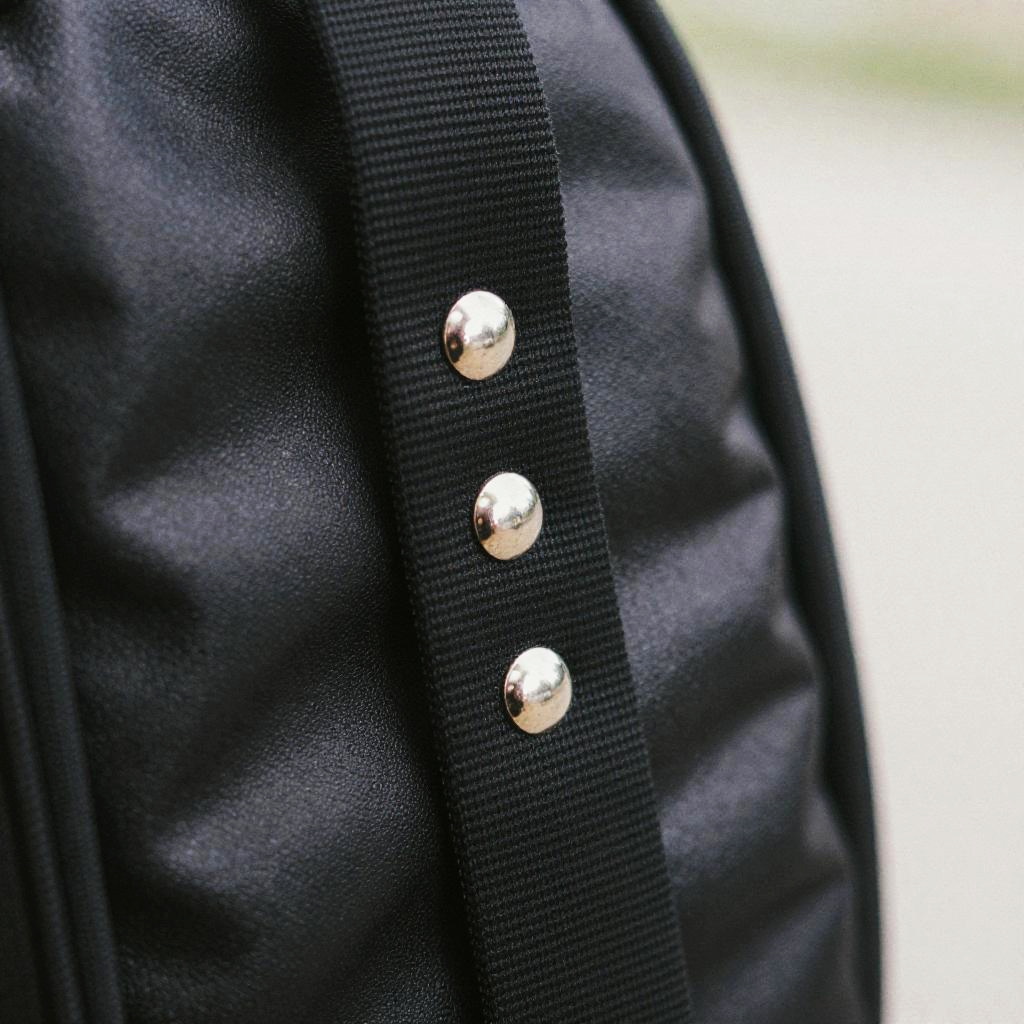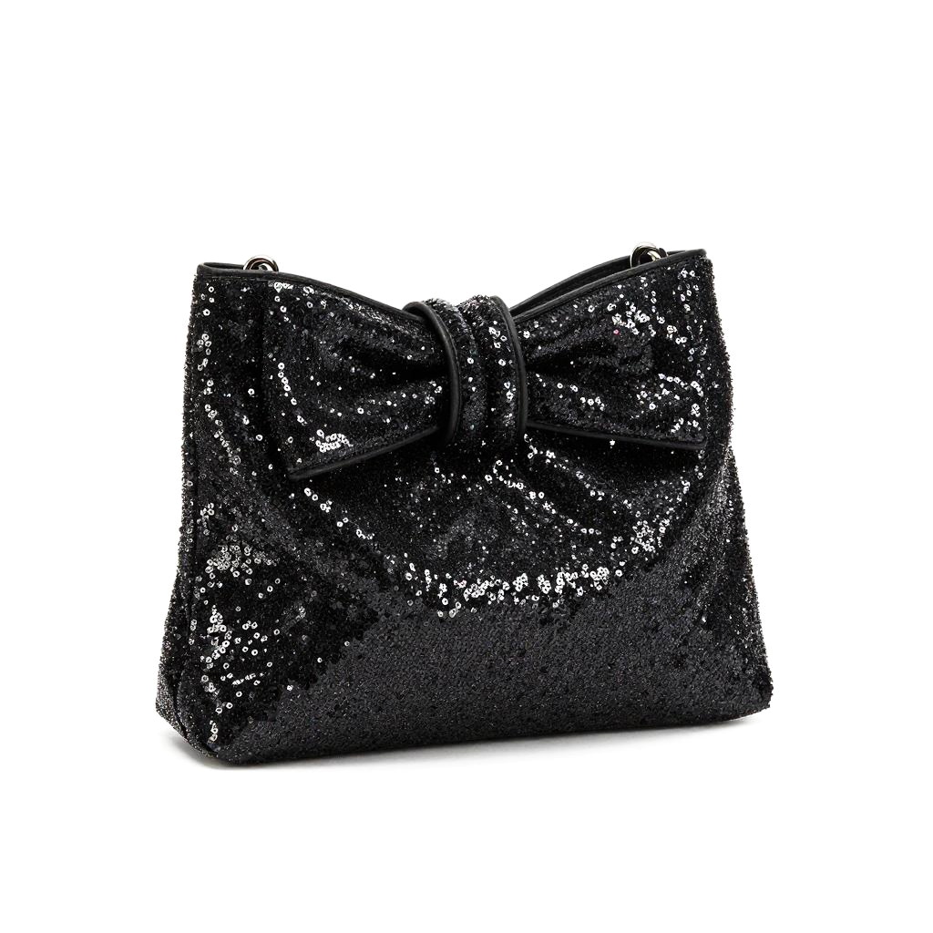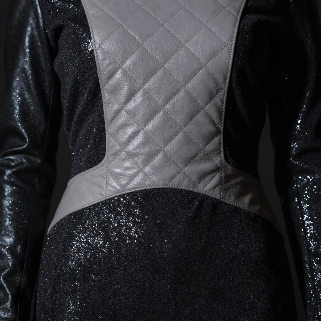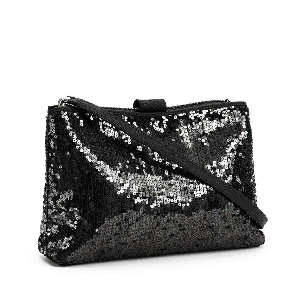Close-up photo of a black sequined fabric with a shiny, textured surface. The sequins are densely packed, creating a sparkling effect with bright white reflections. A subtle triangle pattern is visible, adding a geometric touch to the fabric. The background is a solid grey, making the black sequins stand out even more. The image has a high-contrast, almost abstract feel.