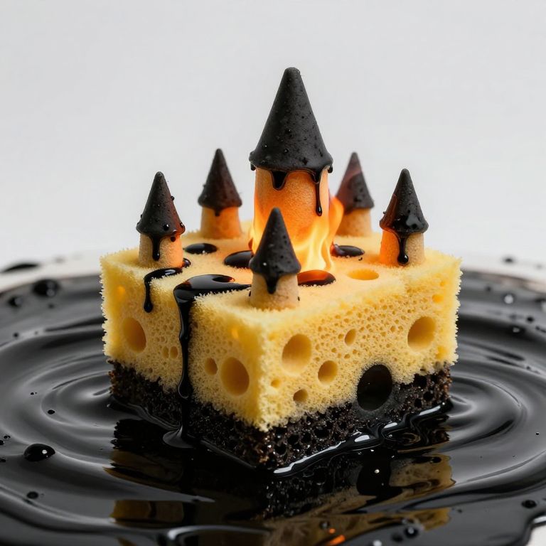 Photograph of a whimsical, castle-shaped dessert floating on a black, glossy surface with ripples. The dessert features a yellow, sponge-like base with circular and oval holes, topped with a black, crumbly layer resembling a castle wall. Seven conical, black-topped towers rise from the top, with an orange, glowing center resembling a candle. Black chocolate drizzle cascades down the sides, adding a dramatic effect. The background is pure white, highlighting the dessert's vibrant colors and textures.