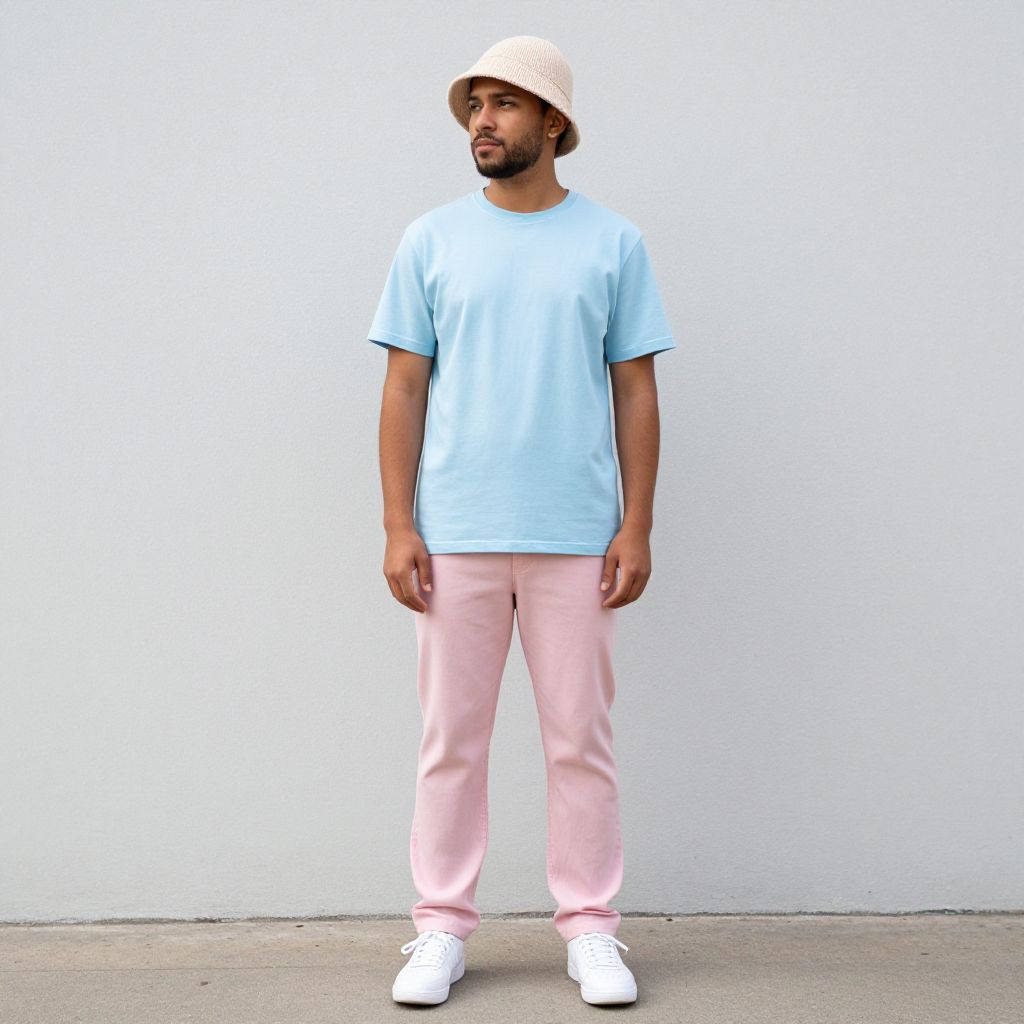 Photograph of a young Black man standing against a plain white wall. He has a short beard and wears a light beige bucket hat, a light blue oversized T-shirt, and pastel pink sweatpants. His white sneakers contrast with his outfit. He stands with his arms relaxed by his sides and gazes slightly to the left. The concrete floor beneath him is smooth and gray. The overall style is casual and minimalist, with a slight 90s streetwear influence. The lighting is bright and even, highlighting the simplicity of his attire and the clean background.