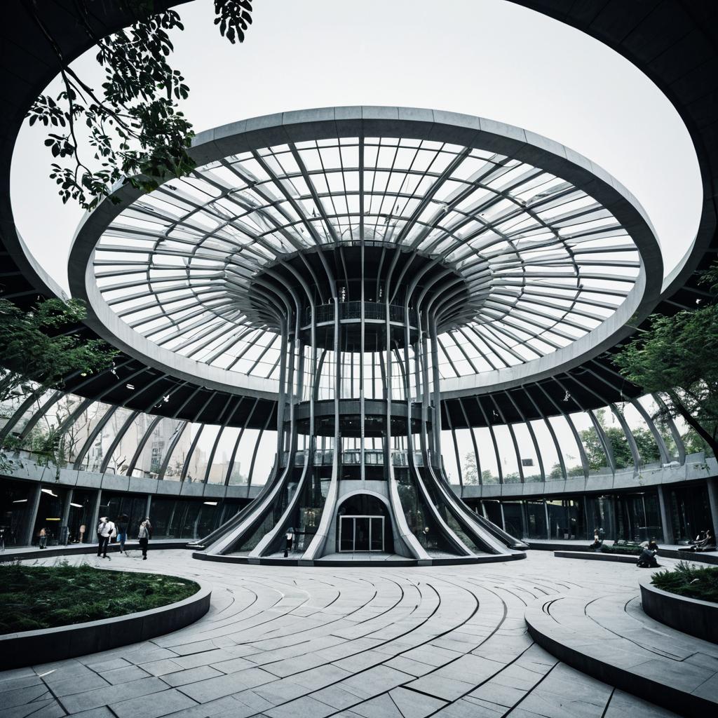 Design a ground floor pavilion of 430 square meter area and 8 meter height for an urban zoo. It should be futuristic, complex, and aesthetic, neo-futuristic architecture