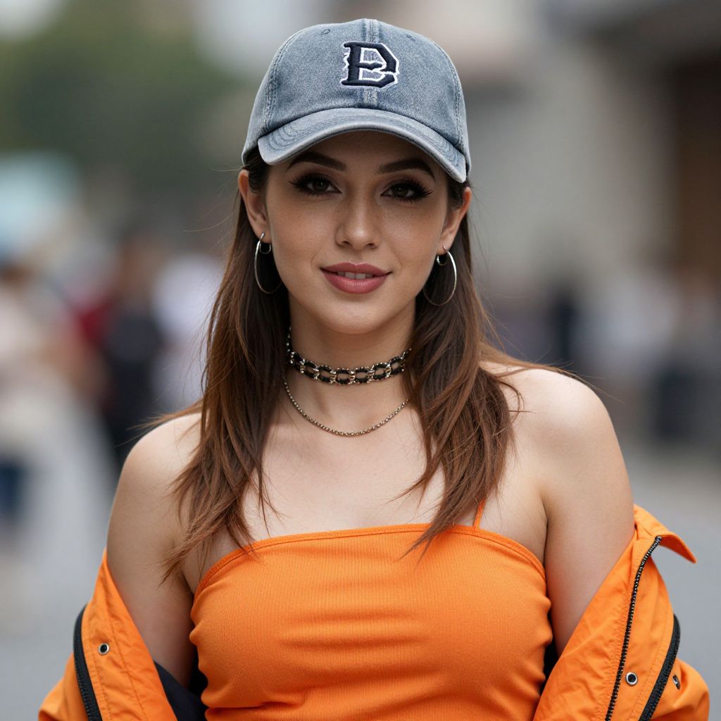 Photograph of a young woman with light olive skin, brown eyes, and long brown hair, wearing a gray baseball cap with a black "D" logo, large silver hoop earrings, and a black choker necklace. She has on an orange, strapless, ribbed top and an orange jacket with black zippers hanging off her shoulders. Her makeup includes dark eyeliner and pink lipstick. The background is blurred, showing a busy street with indistinct people and buildings, suggesting an urban setting. The image has a shallow depth of field, focusing sharply on her face and upper body.