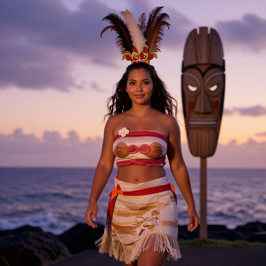 A cinematic-style photograph of a woman in a lifelike Disney Moana Maui costume, walking along a coastal path at sunset on the island of Maui, her face is radiant with a soft glow, her skin has natural brown tones and warm undertones, wearing the full traditional attire with a large feathered headdress and a carved wooden mask in the background, the ocean stretches in the background with soft purple and orange hues. The woman has big tits and cute face