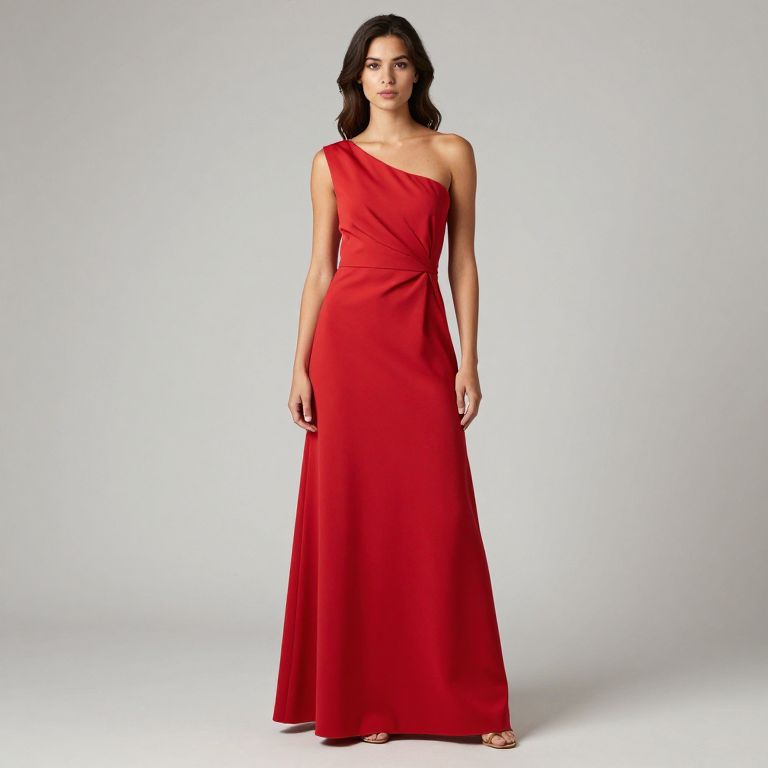 Photograph of a young woman with long, dark brown hair standing against a plain white background. She is wearing a sleeveless, one-shoulder, floor-length red gown that flows smoothly and has a subtle, elegant drape. The gown accentuates her slender figure. She stands with a relaxed posture, arms slightly away from her body, and gazes directly at the camera with a neutral expression. Her skin is light, and she has a natural makeup look. She is wearing red high-heeled sandals, matching her dress. The overall style is chic and sophisticated, with a minimalist, fashion-forward aesthetic.