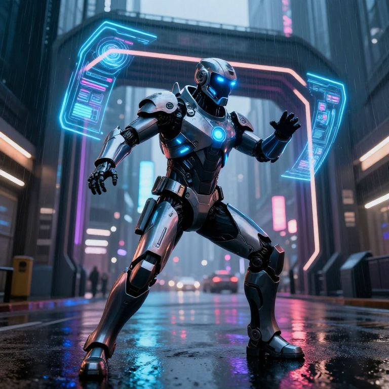 Photorealistic CGI image of a futuristic, silver robotic humanoid standing in a rain-soaked, neon-lit urban street at night. The robot has glowing blue lights on its chest, shoulders, and joints. The background features blurred neon signs in pink and blue, with raindrops reflecting on the wet, glossy street. The robot's design is sleek and metallic, with angular, armored segments and a smooth, helmet-like head. The overall atmosphere is cyberpunk, with a moody, dark color palette enhanced by the bright neon lights.
