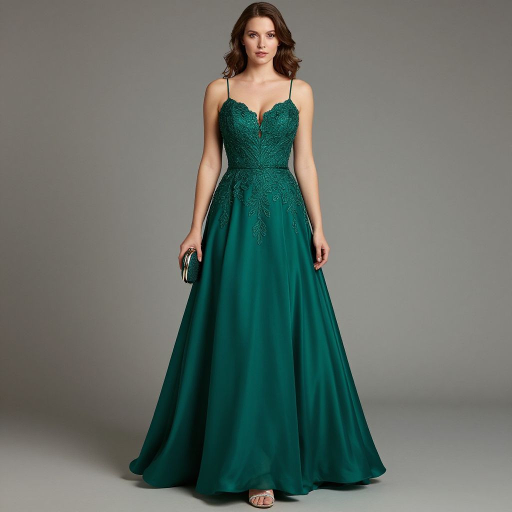 "Elegant plunging neckline, floor-length evening gown, silk satin fabric, deep emerald green, intricate lace appliqué, fitted bodice, flowing A-line skirt, delicate spaghetti straps, subtle shimmer, matching emerald clutch, strappy silver heels.. Sexy. Pretty face and beаutiful eyes. Big breasts."