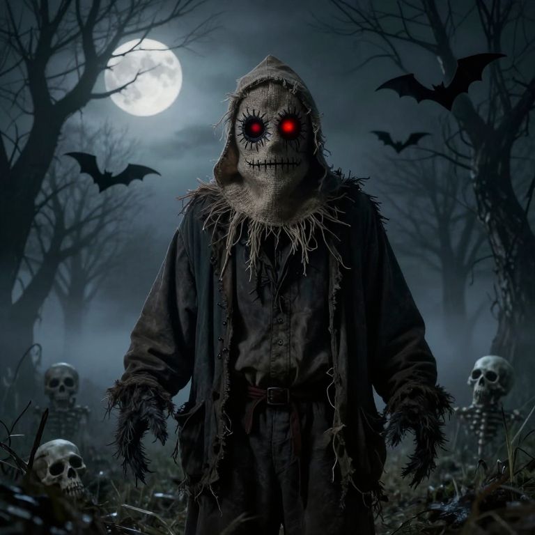 A haunted scarecrow with glowing red eyes in a dark, fog-filled field under a full moon, wearing old farmer clothes and a burlap mask stitched with creepy patterns, surrounded by skeletal trees and bats, eerie and atmospheric horror theme.