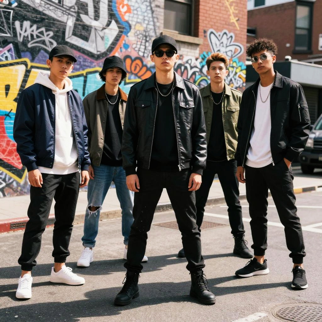 Urban street fashion photography capturing edgy, modern outfits in a bustling city setting, vibrant graffiti walls in the background, natural daylight casting dynamic shadows, diverse models showcasing unique street styles and confident poses, high resolution, cinematic color grading.