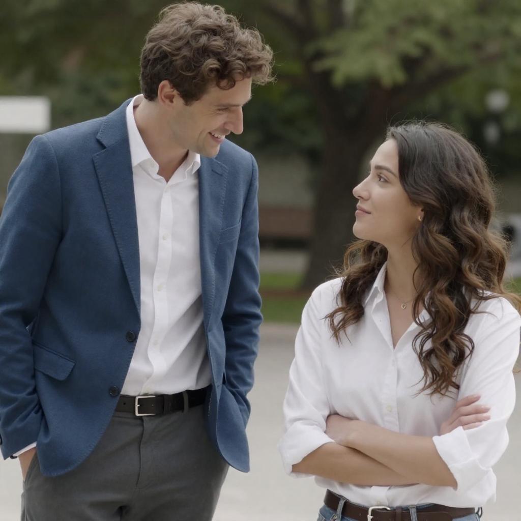 A man with short brown hair, wearing a light blue striped shirt, embraces a woman with short dark brown hair, wearing a pink patterned dress. She looks down, eyes slightly teary. He looks at her intently. Background: beige wall, geometric patterned art. Both have light skin. Indoor setting. Man's hands grip her shoulders.
