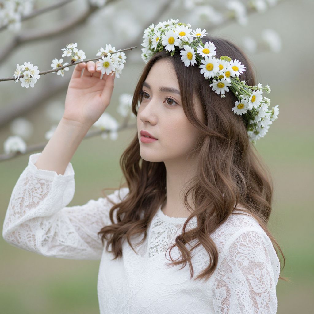 Photograph of a fair-skinned, young woman with wavy, brown hair wearing a white lace dress and a daisy flower crown. She holds a daisy stem to her face with her right hand, gazing softly to the side. Her lips are painted a muted red. The background is softly blurred with green and grey hues, featuring tree branches with white daisies. The overall scene has a natural, springtime feel with a focus on delicate, floral aesthetics.
