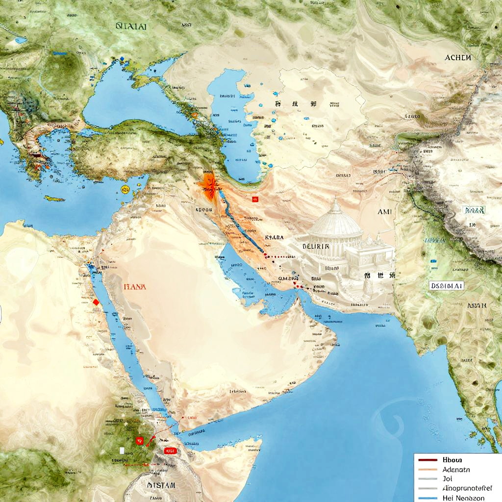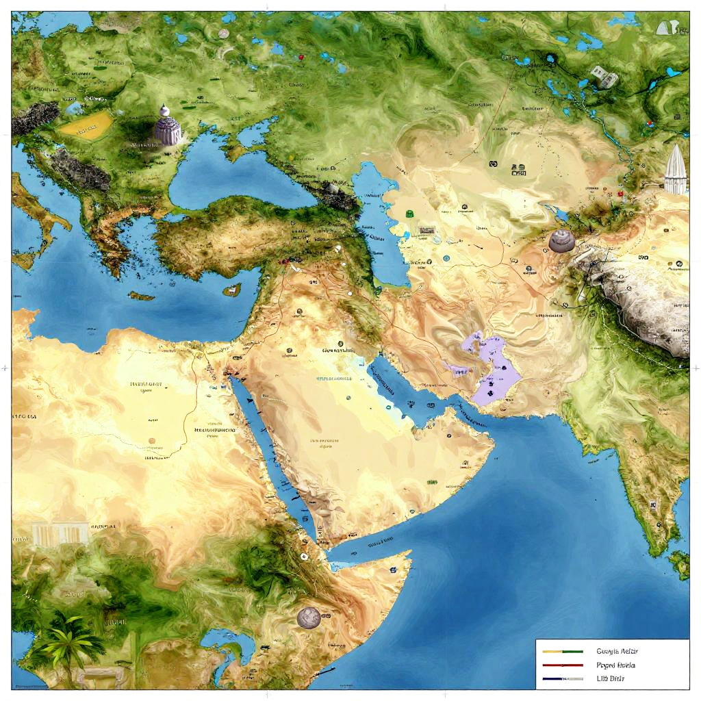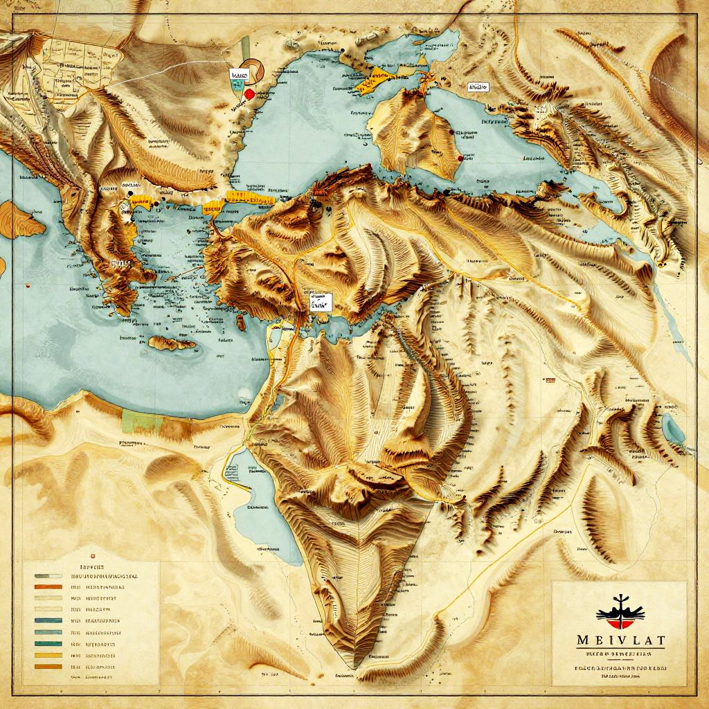 Ancient Israel geography, detailed map with topographic features, deserts, mountains, fertile valleys, historical landmarks, warm earth tones, vintage cartographic style