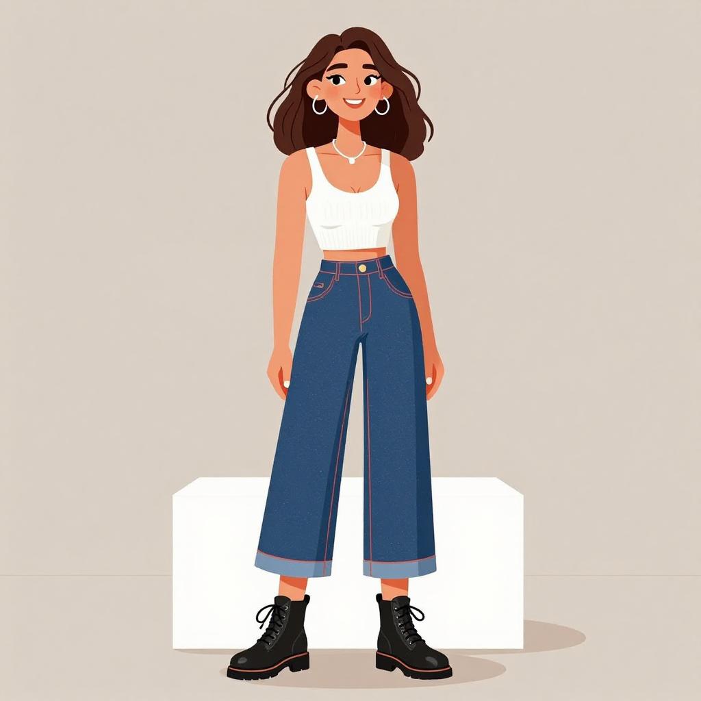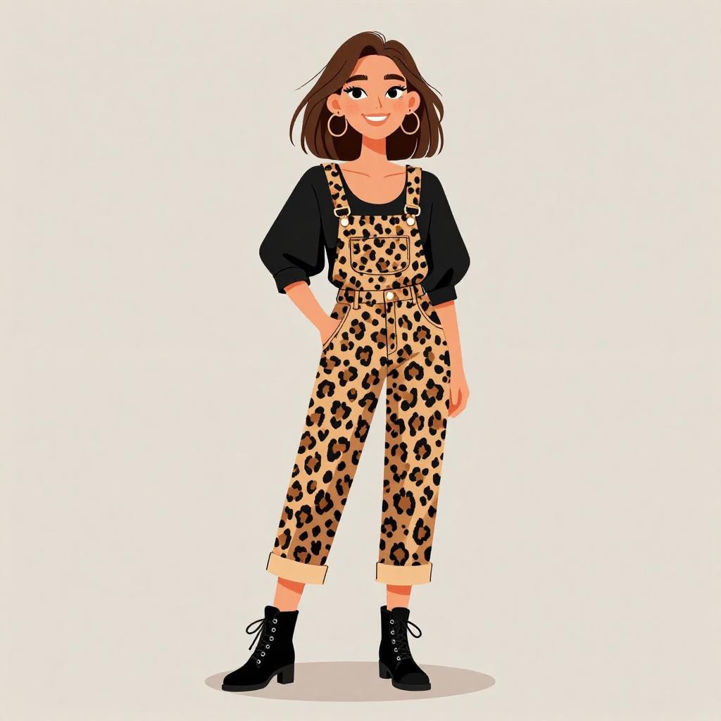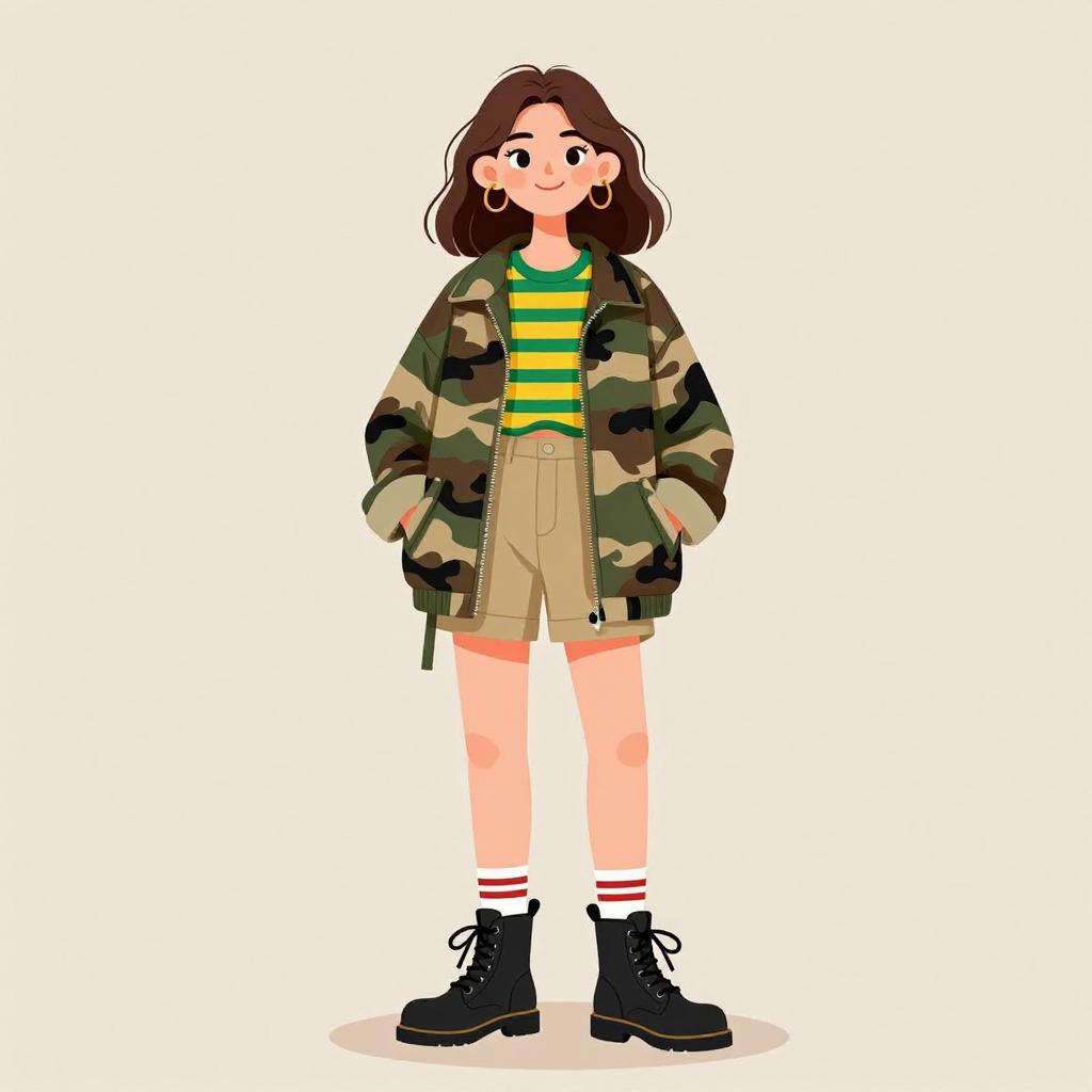 This digital illustration depicts a young woman with fair skin and brown wavy hair, standing against a white background. She wears a camo-patterned bomber jacket over a green and yellow striped shirt, beige high-waisted shorts, white socks with red stripes, and black chunky boots. She has small hoop earrings and a subtle smile. Her hands are relaxed in her jacket pockets. The style is cartoonish with clean lines and bright colors, emphasizing a casual, trendy look.
