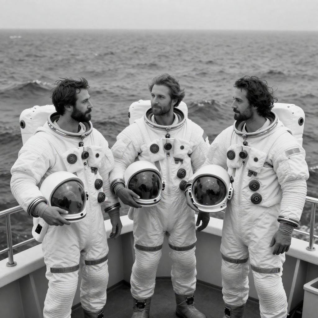 Black-and-white photograph of three men in white space suits standing on a boat, holding helmets and space bags. They have beards and long hair, facing each other with a turbulent ocean in the background. The boat's railing is in the foreground.