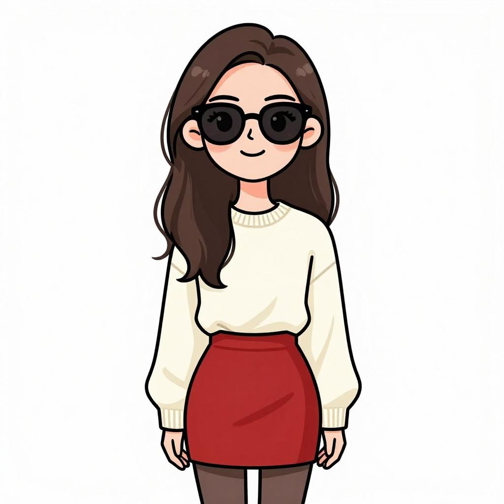 Woman with pretty face and pretty hair. smiling Woman, casual, white knit sweater, crew neck, long sleeves, ribbed hem and cuffs, red A-line mini skirt, opaque black tights, oversized round sunglasses. --sref 1467