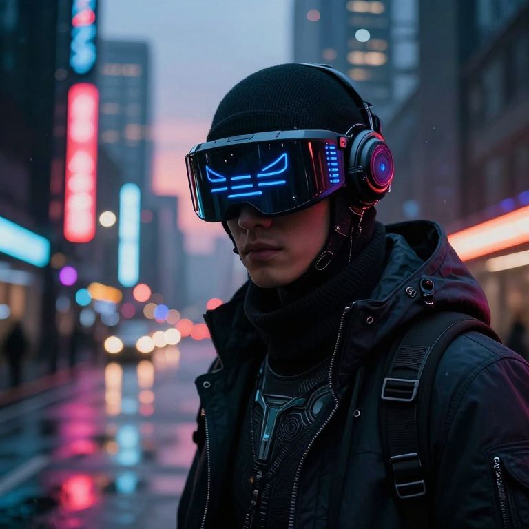 Photograph of a young Asian man with light skin, wearing a black beanie, high-tech visor with blue neon lines, and large over-ear headphones with blue and pink accents. He's dressed in a dark, puffy jacket over a black shirt with a silver emblem. The background is a rainy urban street at dusk, with neon lights in red, blue, and white illuminating the blurred buildings and wet pavement. The man's expression is neutral, and the overall color palette is dark and moody, with vibrant neon highlights.