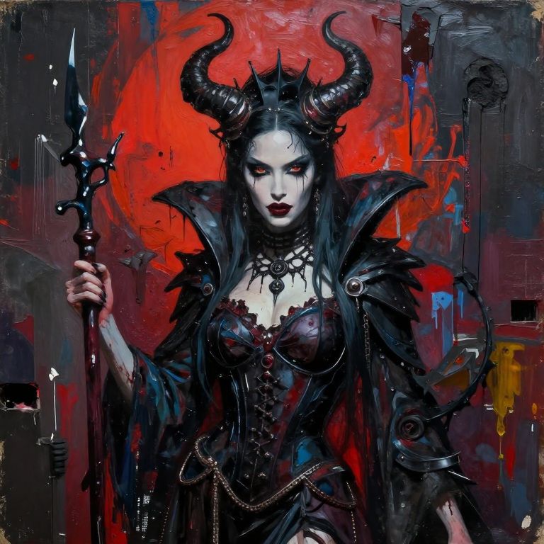 Digital painting of a dark, gothic demon queen with black horns, pale skin, red eyes, black lace corset, and spiked crown, holding