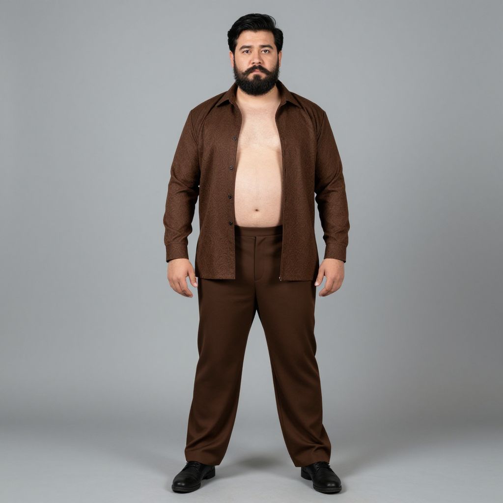 Big man clothing costume, 1boy, male focus, solo, beard, facial hair, standing, full body, mustache, black hair